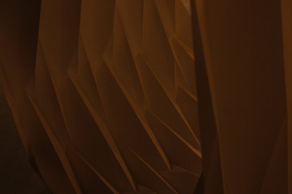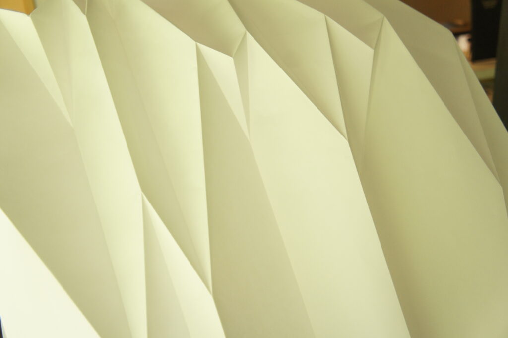 折り紙の世界に「どこにも合わせない」不規則さを作品に取り入れることで一つ一つ異なるパターンが必然的に表れ、人の手と想いが込められた和紙の有機的なテクスチャーと折り紙の技が持つ直線的で無機的なパターンが共存するデザインとなり、その上で大幅に時間が短縮されるという表現の面でも効率の面でも最適なパターンに辿り着いたのでした。