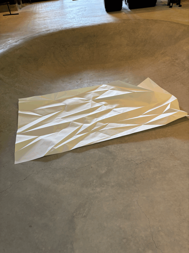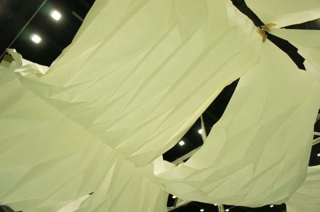 なんせ一枚が1mを超える作品で、それを天井から吊るす方法も和紙の重さや折り筋を付けたときの固さも未知数なので暫定案はあるものの現場である程度手探りで完成させる必要があります。